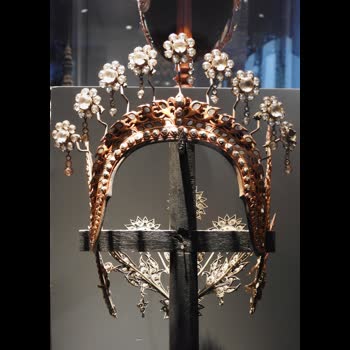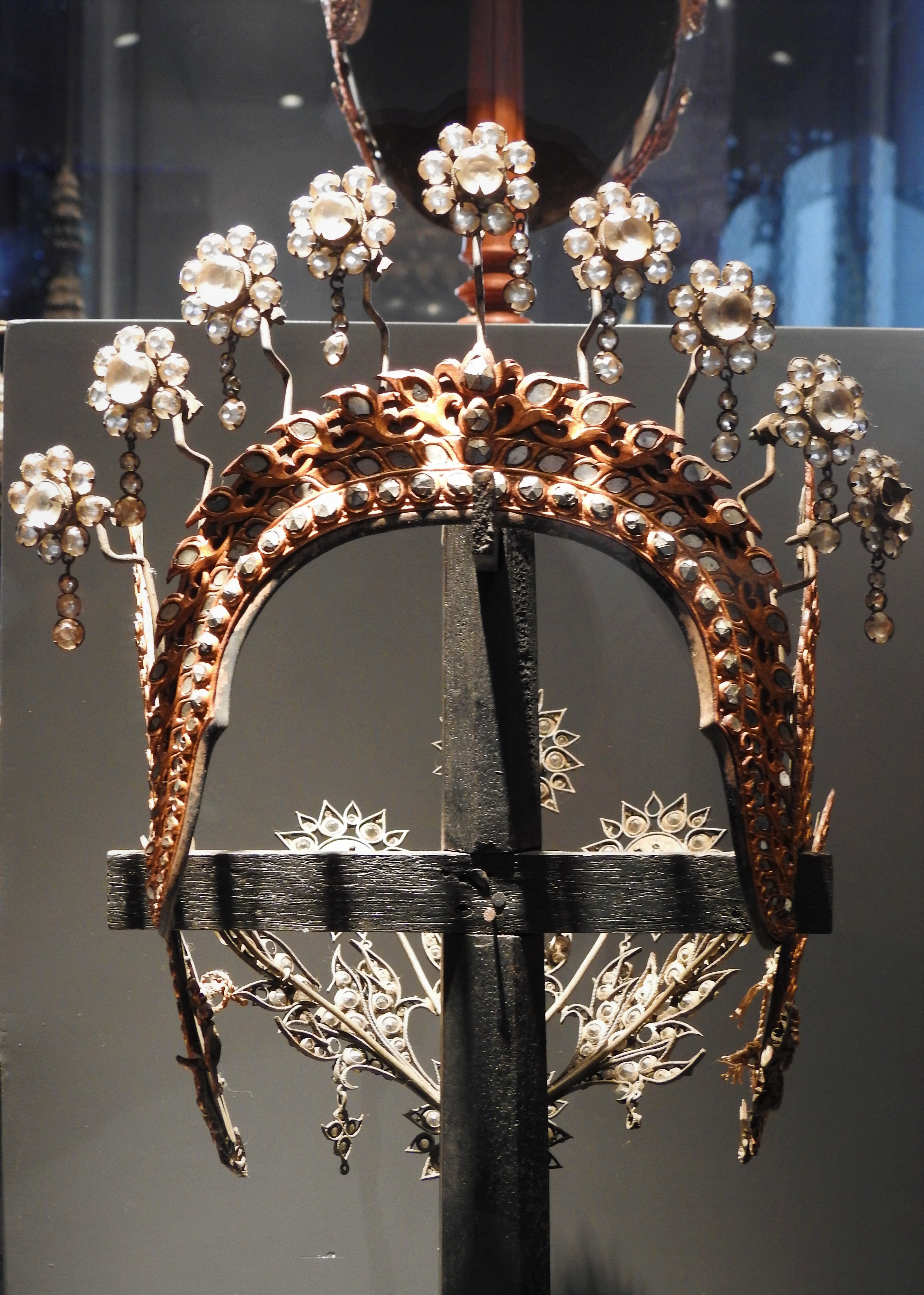| คำอธิบาย : เครื่องศิราภรณ์ ละครรำ ละครรำ เป็นศิลปะการร่ายรำที่เล่นเป็นเรื่องราว มีเอกลักษณ์ในการแสดงและการดำเนินเรื่องด้วยกระบวนลีลาท่ารำ เข้ากับบทร้อง ทำนองเพลงและเพลงหน้าพาทย์ที่บรรเลงด้วยวงปี่พาทย์ การแต่งกายตัวละคร ประกอบด้วยเครื่องแต่งกายที่เลียนแบบมาจากเครื่องต้น หรือเครื่องทรงของพระมหากษัตริย์ ทั้งซื่อเรียกชิ้นส่วนเครื่องแต่งกาย และรูปร่างลักษณะ ที่มา สมบัติของเจ้าพระยามหินทรศักดิ์ธำรง (เพ็ง เพ็ญกุล) เจ้าจอมมารดามรกฎในรัชกาลที่ ๕ มอบให้เมื่อ พ.ศ. ๒๔๓๙ |