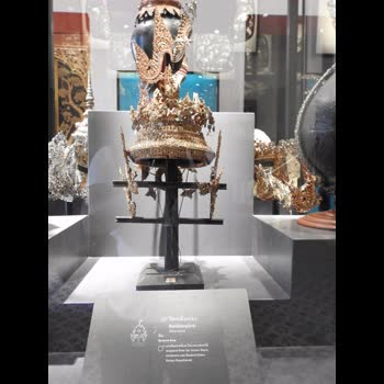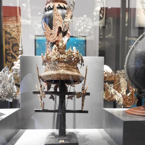 คำอธิบาย : เครื่องศิราภรณ์ ละครรำ ละครรำ เป็นศิลปะการร่ายรำที่เล่นเป็นเรื่องราว มีเอกลักษณ์ในการแสดงและการดำเนินเรื่องด้วยกระบวนลีลาท่ารำ เข้ากับบทร้อง ทำนองเพลงและเพลงหน้าพาทย์ที่บรรเลงด้วยวงปี่พาทย์ การแต่งกายตัวละคร ประกอบด้วยเครื่องแต่งกายที่เลียนแบบมาจากเครื่องต้น หรือเครื่องทรงของพระมหากษัตริย์ ทั้งซื่อเรียกชิ้นส่วนเครื่องแต่งกาย และรูปร่างลักษณะ ที่มา สมบัติของเจ้าพระยามหินทรศักดิ์ธำรง (เพ็ง เพ็ญกุล) เจ้าจอมมารดามรกฎในรัชกาลที่ ๕ มอบให้เมื่อ พ.ศ. ๒๔๓๙ |