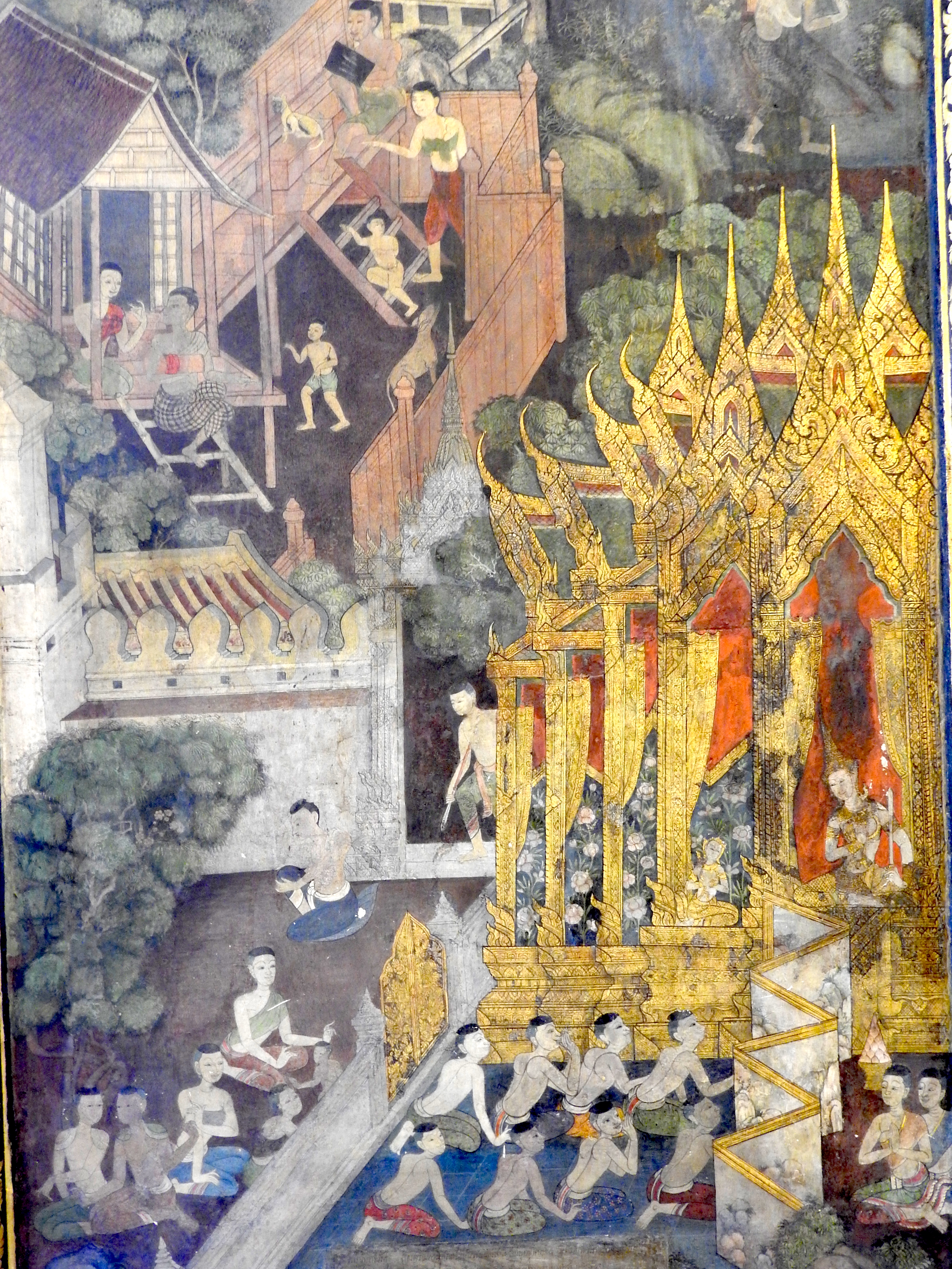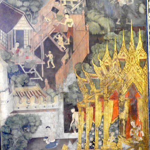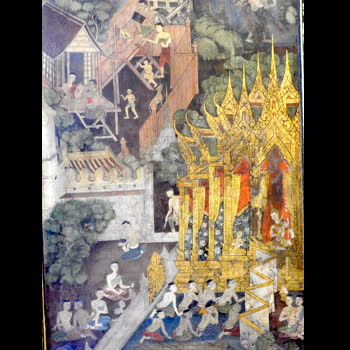 | คำอธิบาย : จิตรกรรมฝาผนังอายุเกือบ ๒๐๐ ปี สะท้อนวิถีชีวิตชาวสยาม ความศรัทธาในพระพุทธศาสนา อารยธรรมที่ผสานศิลปะแบบจีน ซึ่งเป็นเอกลักษณ์ ของจิตรกรรมสมัยพระบาทสมเด็จพระนั่งเกล้าเจ้าอยู่หัว ในพระวิหารพระพุทธไสยาสน์ที่งดงาม |