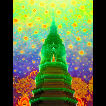 | คำอธิบาย : จิตรกรรมฝาผนังบน ชั้น ๕ พระมหาเจดีย์มหารัชมงคล วัดปากน้ำ ภาษีเจริญ แสดงเรื่องราวของโลกุตรภูมิ ตอนล่างของภาพ เป็นภาพวาดอดีตพระพุทธเจ้า ๒๘ พระองค์ ประทับนั่งขัดสมาธิราบ ภายในซุ้มเรือนแก้ว บนดอกบัว พระหัตถ์แสดงปางสมาธิทุกพระองค์ ประทับนั่งใต้ต้นไม้ที่พระองค์ตรัสรู้อนุตตรสัมมาสัมโพธิญาณ ฯลฯ |