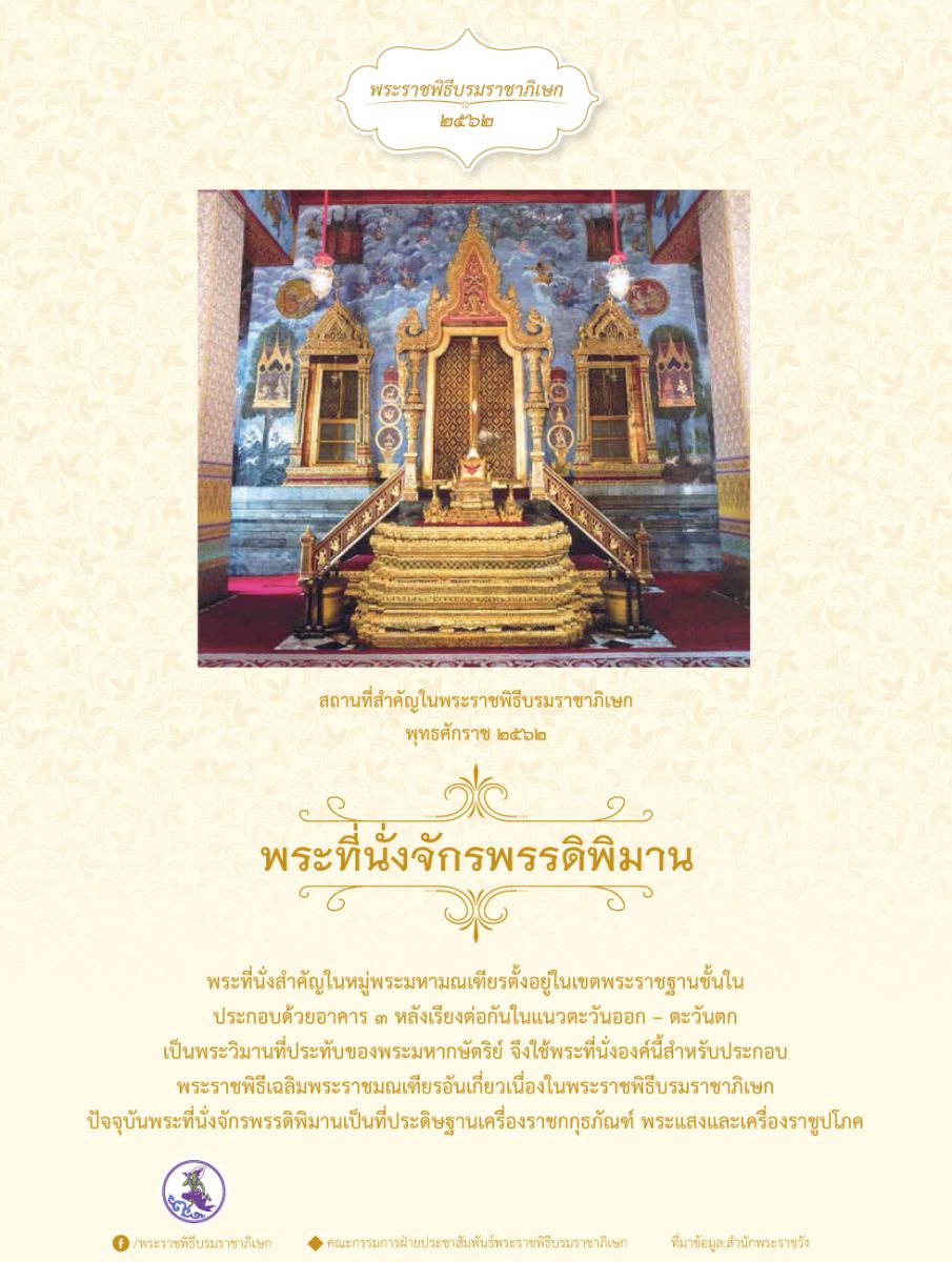 (2562). "สถานที่สำคัญในพระราชพิธีบรมราชาภิเษก พระที่นั่งจักรพรรดิพิมาน".