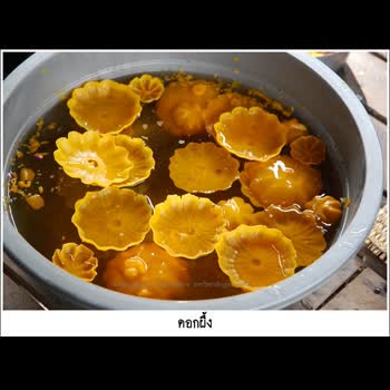| คำอธิบาย : ดอกผึ้ง ทำมาจากขี้ผึ้ง โดยจะนำขี้ผึ้งมาอุ่นให้หลอมละลาย จากนั้นนำแม่พิมพ์รูปร่างคล้ายดอกไม้ เช่น ผลโพธิ์ทะเล แครอทแกะสลัก ก้นมะละกอ นำมาจุ่มขี้ผึ้ง แล้วนำไปจุ่มน้ำเย็น ดอกผึ้งก็จะหลุดออกจากพิมพ์ ได้ดอกผึ้งตามที่ต้องการ ดอกผึ้งจะมีหลายขนาด จะมีการออกแบบโดยการนำมาวางซ้อนกันให้เป็นชั้น ๆ แล้วติดดอกไม้สดมาทำเป็นเกสรดอกผึ้ง เช่น ดอกบานไม่รู้โรย ดอกดาวเรือง จากนั้นนำไปติดประดับตามส่วนต่าง ๆ ของปราสาทผึ้ง ดอกผึ้งจะเป็นตัวแทนของรวงผึ้งที่ลิงนำไปถวายพระพุทธเจ้าในตำนานทางพระพุทธศาสนา |