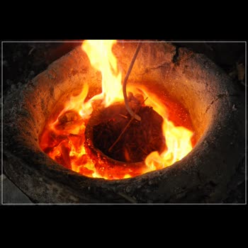 | คำอธิบาย : การหลอมทองเหลืองในงานหัตถกรรมทำเครื่องทองเหลืองบ้านปะอาว จังหวัดอุบลราชธานี เพื่อจะนำไปเทลงในแม่พิมพ์นั้น เริ่มจากการอุ่นเบ้าหลอมก่อน โดยวางเบ้าหลอมไว้บนเตาถ่านที่ให้ความร้อนสูง จากนั้นนำทองเหลือง หรือโลหะอื่น ๆ ที่ต้องการหลอมใส่ลงในเบ้าหลอม การหลอมจะใช้ความร้อนอุณหภูมิประมาณ 1100 องศาเซลเซียส ทองเหลืองและโลหะจึงจะหลอมละลายเป็นของเหลว |