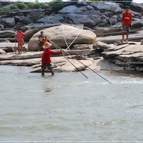 | คำอธิบาย : ชาวบ้านในอำเภอโพธิ์ไทร จังหวัดอุบลราชธานี ที่อาศัยอยู่ใกล้กับแม่น้ำโขง หรือบริเวณที่เรียกว่า ปากบ้อง จะมีวิธีการจับปลาที่ว่ายทวนน้ำมาโดยการใช้อุปกรณ์ที่เรียกว่า ช้อนตักปลา มีลักษณะคล้ายช้อนขนาดใหญ่ ทำจากไม้ไผ่ 2 อัน ขึงตาข่ายระหว่างไม้ทั้งสอง สามารถใช้งานได้ตลอดทั้งปี เป็นวิถีชีวิตที่สืบทอดกันมานาน |