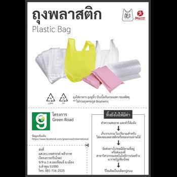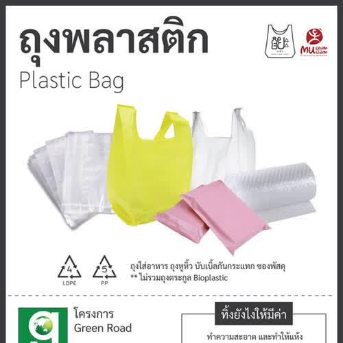 | คำอธิบาย : ถุงพลาสติกเป็นขยะพลาสติกที่มีการใช้ครั้งเดียวแล้วทิ้ง และก่อให้เกิดปัญหากับสิ่งแวดล้อมค่อนข้างเยอะและเป็นวงกว้าง การช่วยลดปัญหาขยะจากถุงพลาสติกที่ง่ายที่สุดคือการนำกลับมาใช้ซ้ำหลายๆ ครั้ง หรือทำความสะอาดแล้วเก็บรวบรวมนำไปส่งให้องค์กรที่รับนำไปรีไซเคิลเป็นอิฐปูพื้น หรืออื่นๆ |