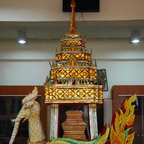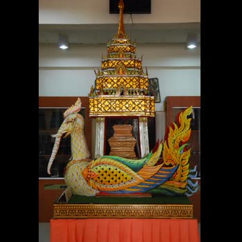 | คำอธิบาย : เมรุนกหัสดีลิงค์จำลอง จัดแสดงไว้ที่พิพิธภัณฑ์เมืองเกษมสีมา วัดเกษมสำราญ อำเภอตระการพืชผล จังหวัดอุบลราชธานี เป็นผลงานฝีมือของพระครูเกษมธรรมานุวัตร เจ้าอาวาสผู้มีความรู้ความสามารถด้านศิลปวัฒนธรรมท้องถิ่นอีสาน ได้จัดทำขึ้นเพื่ออนุรักษ์และสืบสานไว้ให้อนุชนรุ่นหลังได้ศึกษา |