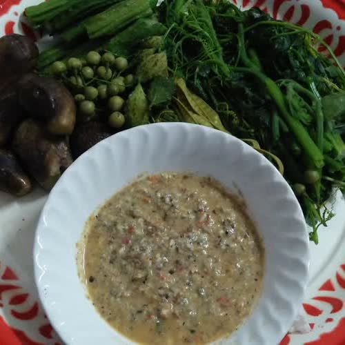 | คำอธิบาย : น้ำพริกจี้กุ่ง คือ เมนูการตำน้ำพริกโดยใช้จิกุ่ง หรือ จิโปม จิ้งโกร่ง เป็นส่วนผสมหลัก รับประทานกับผักสด ผักต้ม เป็นอาหารพื้นถิ่นทางภาคเหนือ และภาคอีสาน ตามวิถีภูมิปัญญาชาวบ้าน |