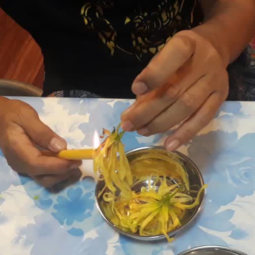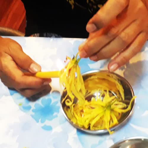 | คำอธิบาย : กระดังงา : กลิ่นที่ล้ำค่าเมื่อนำมาลนไฟในดอกกระดังงามีน้ำมันหอมระเหยเรียกว่า\" Ylang Ylang oil ใช้ลนได้เฉพาะกระดังงาไทยจะมีน้ำมันหอมระเหยมาก แต่วันนี้ไม่มี มีแต่กระดังงาสงขลา เลยนำมาลนไฟให้ดูกันคะ กระดังงาสงขลา ถ้าจะให้หอมดีต้องใช้ดอกที่สีเหลืองแก่ จะหอม โดยลนกระเปาะแล้ว เลยไปลนตรงกลีบด้วย เล็กน้อยให้ช้ำๆ ลนเสร็จแล้วเอานิ้วบีบกระเปาะให้แตก ใช้เฉพาะกลีบ เวลาใช้ให้ฉีกกลีบออกแช่ในน้ำลอยดอกไม้สด หรืออบขนมไทยๆบางชนิดที่เราต้องการให้มีกลิ่นหอม |