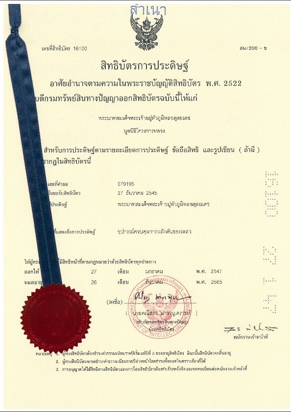 สิทธิบัตรในพระปรมาภิไธยเลขที่ 16100 อุปกรณ์ควบคุมการผลักดันของเหลว ได้รับใบอนุญาตภายใต้