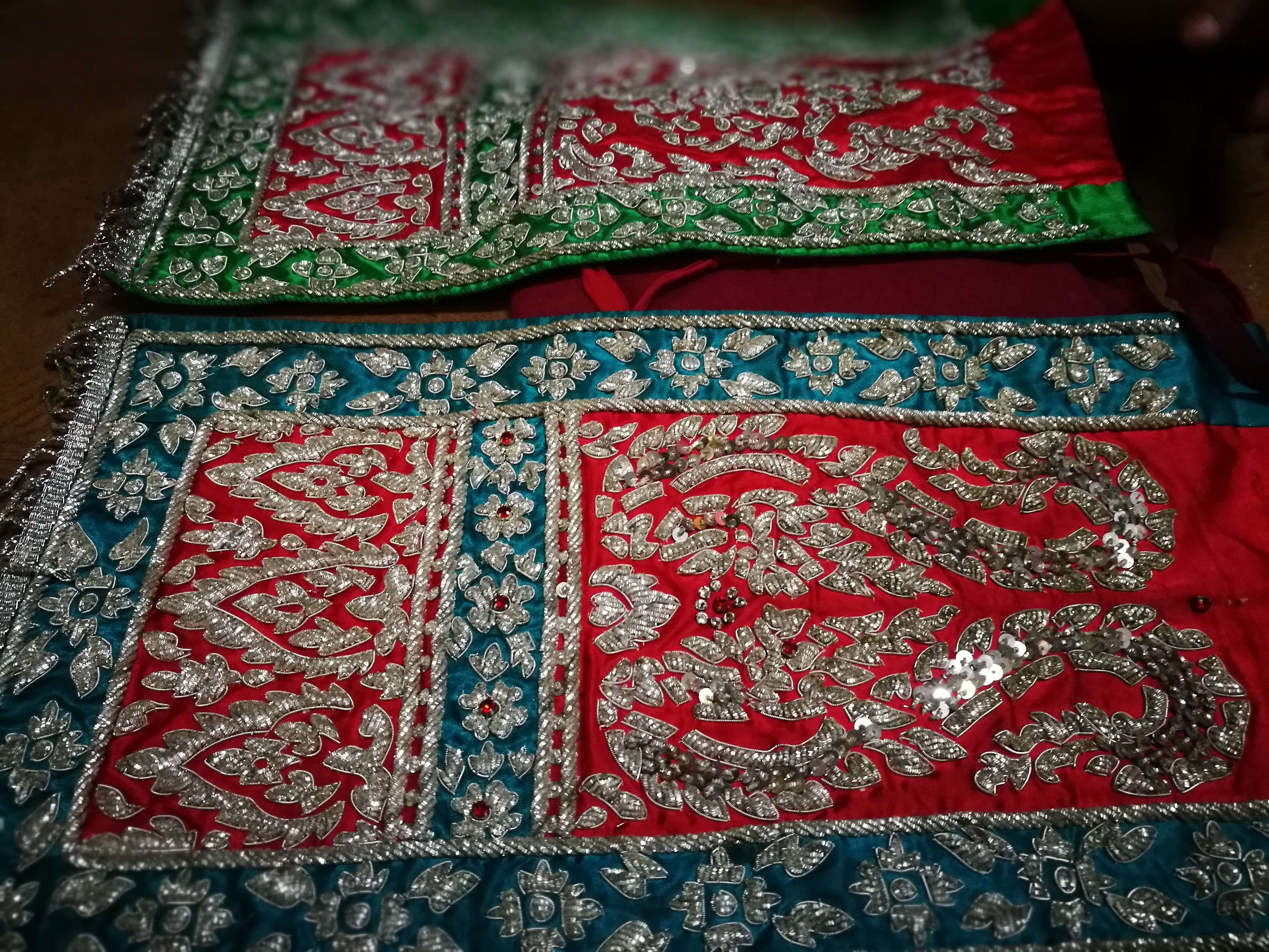 | คำอธิบาย : ด้านบน คือ ห้อยหน้าเจียรบาทสีแดงลายพญานาค ถัดมาเป็นห้อยหน้าเจียรบาทสีแดง แต่เป็นลายเทพนมโดยเจียระบาดคือผ้าคาดเอวชนิดหนึ่ง มีชายห้อยลงที่หน้าขา |
