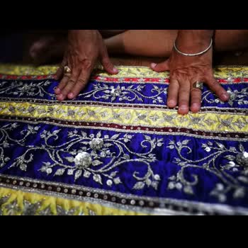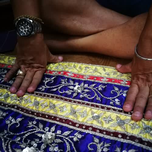 | คำอธิบาย : ผ้าห่มนาง สีม่วงผืนนี้เป็นลายเลื้อยโปร่งกว่า ซึ่งเป็นลายเก่าสมัย ร.๗ ที่ได้ลายต้นแบบจากของคุณหลวงราชพงษ์ ทางบ้านเครื่องคุณรัตน์ได้ขอแบบลายมาจากพี่ที่นับถือมาทำ ๔ ผืน นำมาปักตามต้นแบบแค่ครึ่งตัวของลายและต่อมาก็ปรับลาย พลิกลายซ้าย ขวา ต่างๆ จนเป็นที่เห็นนี้ ใช้ในเครื่องนางฟ้า หรือระบำเบ็ดเตล็ด หรือตัวเอกในละครต่างๆ |