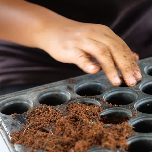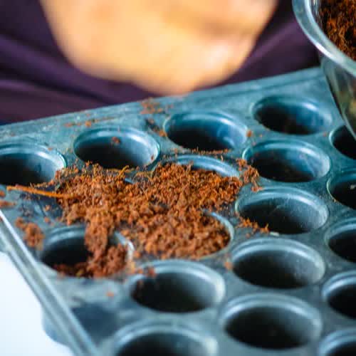 | คำอธิบาย : แล้วนำขุยมะพร้าวที่ผสมมูลไส้เดือนแล้ว ไปใส่ที่ถาดเพาะ เพื่อเตรียมการเพาะ |