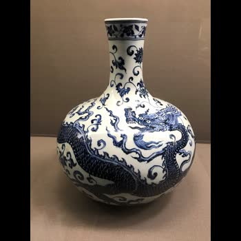 | คำอธิบาย : Celestial globe vase with decoration of dragon among lotus blossoms แจกันลายครามมังกร รัชสมัยจักรพรรดิหย่งเล่อยุคราชวงศ์หมิง |