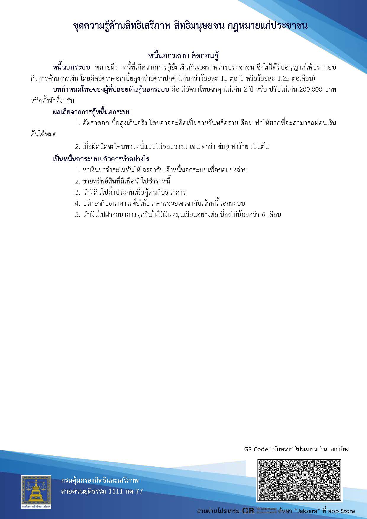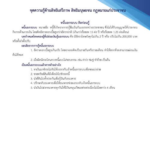 | คำสำคัญ : หนี้นอกระบบ คิดก่อนกู้, หนี้นอกระบบ, กรมคุ้มครองสิทธิและเสรีภาพ, เงินกู้ |
