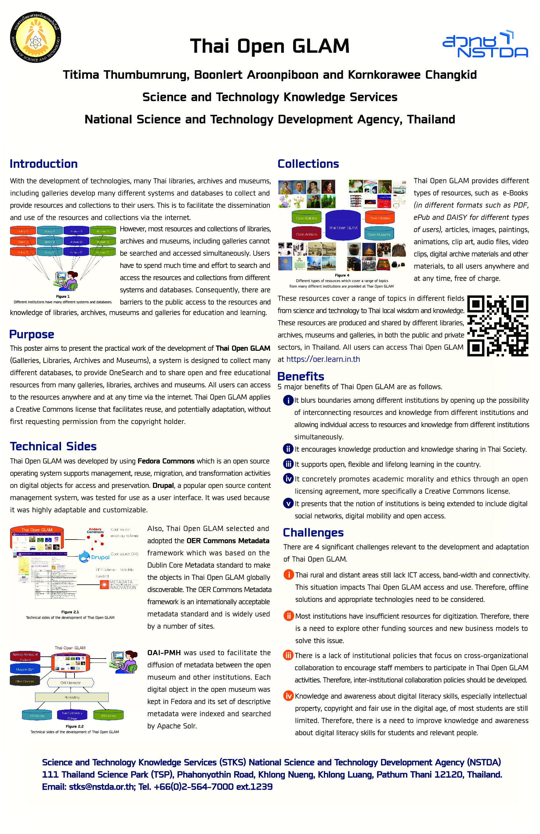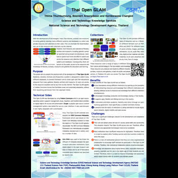 | คำอธิบาย : Thai Open GLAM is a poster which is presented in the 1st International Conference on Library and Information Science : From Open Library to Open Society (iCoo 2018), on 18-19 August 2018 at Sukhothai Thammathirat Open University โปสเตอร์ เรื่อง Thai Open GLAM เสนอในงาน The 1st International Conference on Library and Information Science : From Open Library to Open Society (iCoo 2018) ระหว่างวันที่ 18-19 สิงหาคม 2561 ณ มหาวิทยาลัยสุโขทัยธรรมาธิราช จังหวัดนนทบุรี |