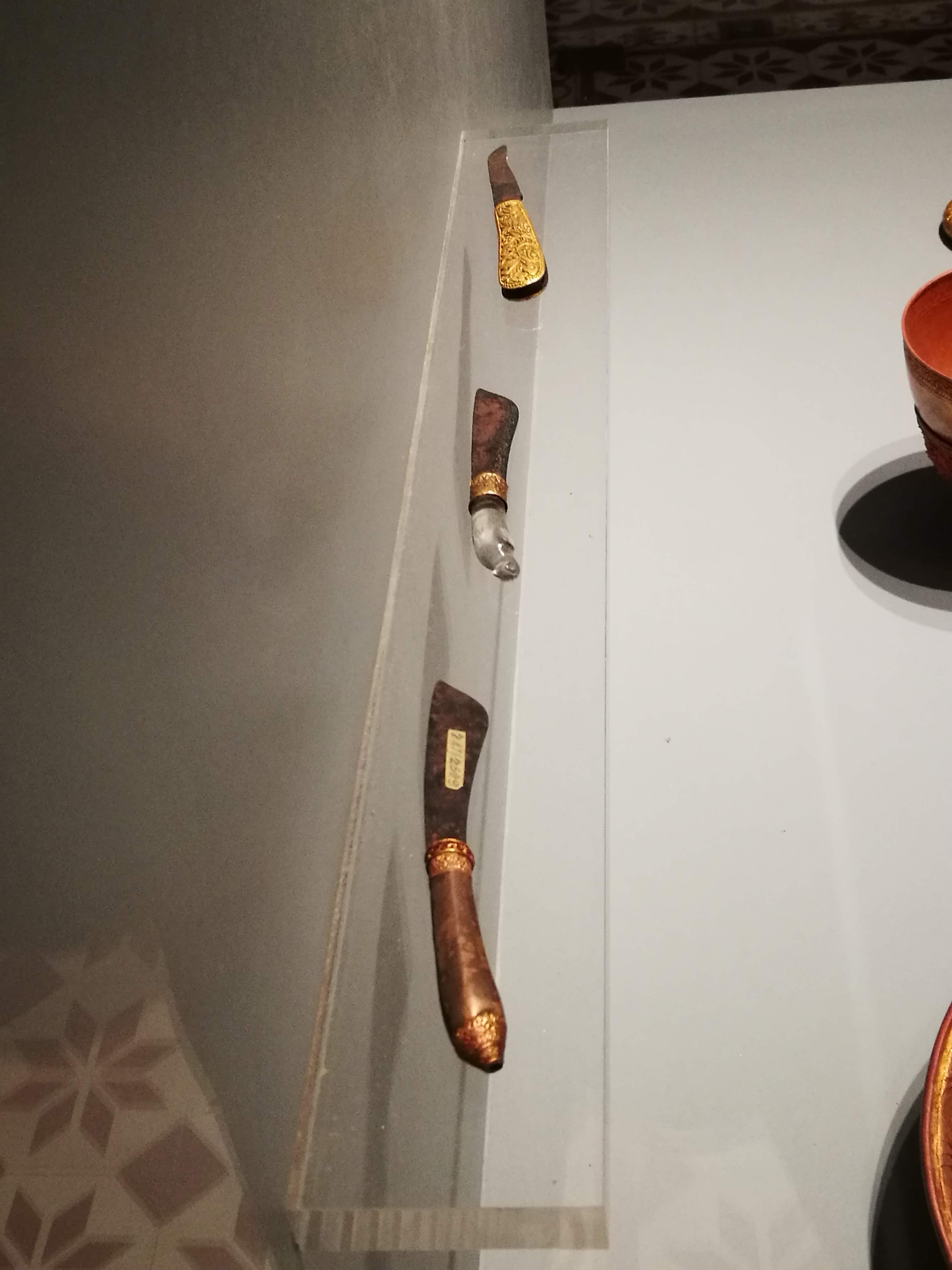 คำอธิบาย : มีดเจียนหมาก ด้ามนาก ปลอกและส้นทองคำสลักลาย ปลอกฝังพลอยแดงมีดเจียนหมาก ด้ามแก้วสลักรูปนก หุ้มปลอกทองคำสลักลาย ใบมีดตกแต่งด้วยคร่ำทอง มีดพับด้ามทองคำ สลักลายพันธุ์พฤกษา |