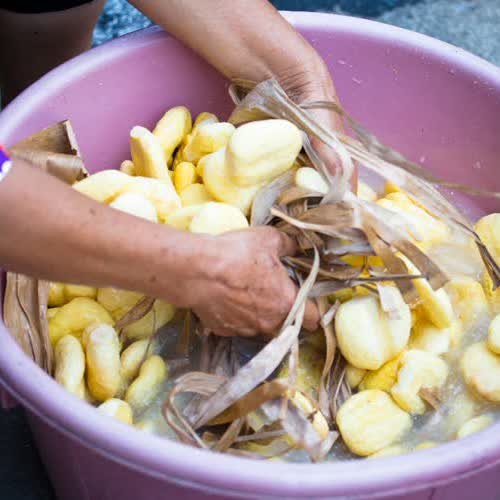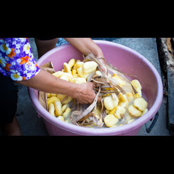 | คำอธิบาย : ใช้ใบตองแห้งมาขัดจาวตาล ก่อนเอาไปเชื่อม |