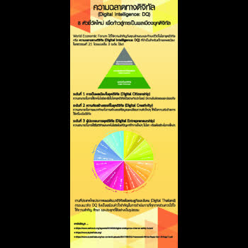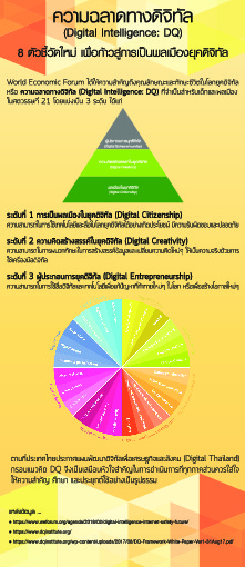 | คำอธิบาย : ความฉลาดทางดิจิทัล (Digital Intelligence: DQ) 8 ตัวชี้วัดใหม่ เพื่อก้าวสู่การเป็นพลเมืองยุคดิจิทัล World Economic Forum ได้ให้ความสำคัญถึงคุณลักษณะและทักษะชีวิตในโลกยุคดิจิทัล หรือ "ความฉลาดทางดิจิทัล (Digital Intelligence: DQ)" ที่จำเป็นสำหรับเด็กและพลเมืองในศตวรรษที่ 21 โดยแบ่งเป็น 3 ระดับได้แก่ ระดับที่ 1 การเป็นพลเมืองในยุคดิจิทัล (Digital Citizenship) ระดับที่ 2 ความคิดสร้างสรรค์ในยุคดิจิทัล (Digital Creativity) ระดับที่ 3 ผู้ประกอบการยุคดิจิทัล (Digital Entrepreneurship) |