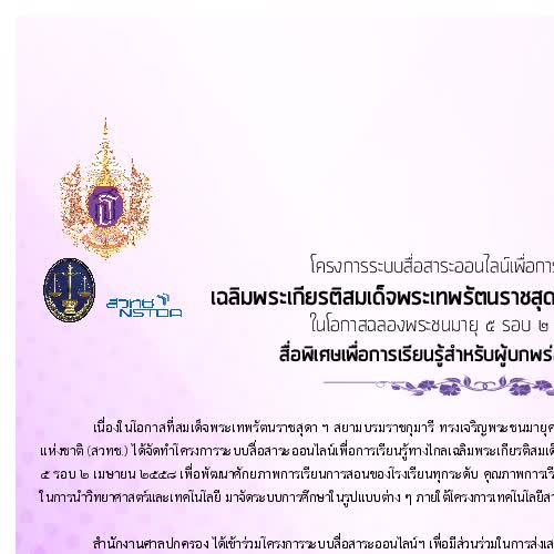 | คำอธิบาย : สื่อพิเศษเพื่อการเรียนรู้สำหรับผู้บกพร่องด้านการมองเห็น สำนักงานศาลปกครอง เข้าร่วมโครงการระบบสื่อสาระออนไลน์เพื่อการเรียนรู้ทางไกลฯ มีส่วนร่วมในการส่งเสริมการเรียนรู้ตลอดชีวิตของประชาชน ด้วยการเผยแพร่ข้อมูลความรู้เกี่ยวกับกฎหมายปกครอง ศาลปกครอง และกระบวนการยุติธรรมทางปกครองให้แก่ทุกภาตคส่วนในสังคม โดยมีเป้าประสงค์ในการพัฒนาคุณภาพการเรียนรู้ รวมถึงการเข้าถึงความรู้เกี่ยวกับศาลปกครอง ของนักเรียน นักศึกษา ผู้ที่สนใจ และผู้ด้อยโอกาส ผ่านระบบเทคโนโลยีสารสนเทศที่เหมาะสม ด้วยสื่อการเรียนรู้ที่มีการจัดการเรื่องการนำทรัพย์สินทางปัญญามาใช้อย่างถูกต้องโดยไม่ละเมิดลิขสิทธิ์ |