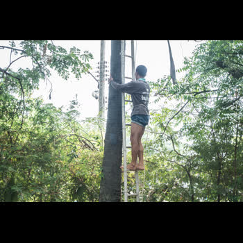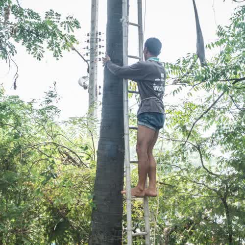 | คำอธิบาย : เริ่มปีนต้นตาล โดยใช้บันไดช่วยผ่อนแรงก่อนในช่วงแรก |
