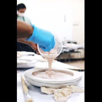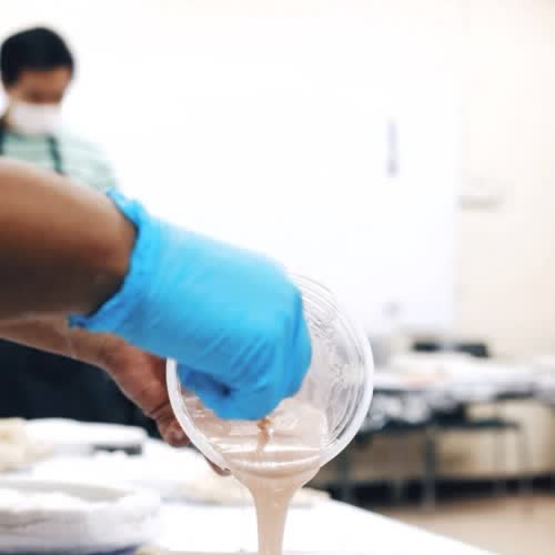 | คำอธิบาย : การเทเรซิ่นลงใส่พิมพ์ยาง |