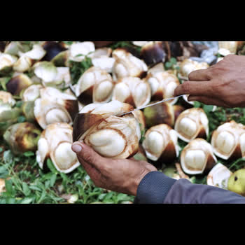 | คำอธิบาย : การสาธิตเฉาะเม็ดตาล จากผลตาลอ่อนที่เพิ่งเก็บมาจากต้นใหม่ๆ |