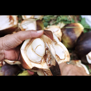 | คำอธิบาย : การสาธิตเฉาะเม็ดตาล จากผลตาลอ่อนที่เพิ่งเก็บมาจากต้นใหม่ๆ |