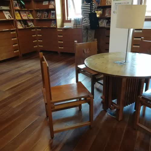 | คำอธิบาย : โต๊ะและเก้าอี้ไม้สำหรับผู้ใช้บริการภายใน Beitou Library หรือ ห้องสมุดประชาชนเป่ยโถว ห้องสมุดสีเขียว (Green library) แห่งแรกในไต้หวันที่ได้ใบรับรองให้เป็น Green Building หรืออาคารสีเขียวที่เป็นมิตรกับสิ่งแวดล้อม |