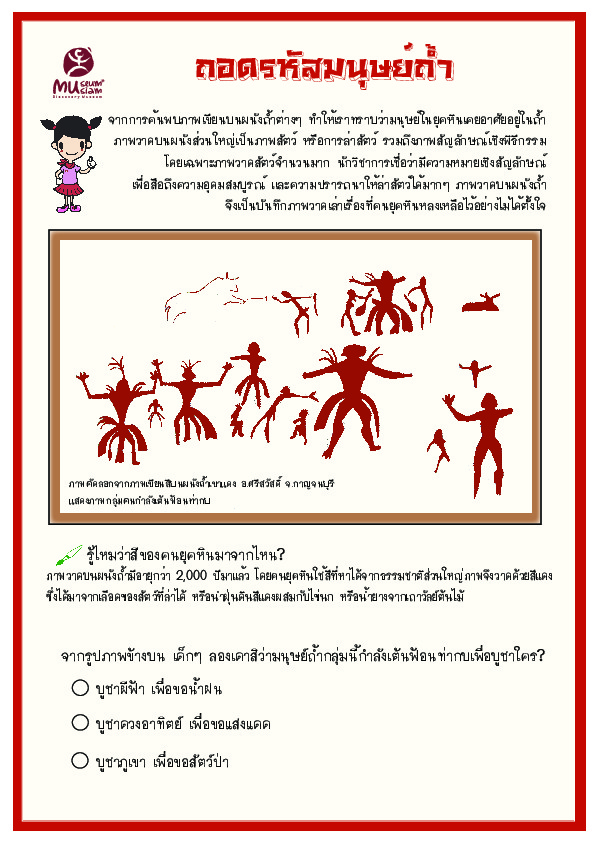 | คำสำคัญ : ภาพวาดสัตว์, ใบงาน, ภาพวาดบนผนังสัตว์, มนุษย์ยุคหิน, สื่อการเรียนรู้, มิวเซียมสยาม, ภาพเขียนสี, มนุษย์ถ้ำ |