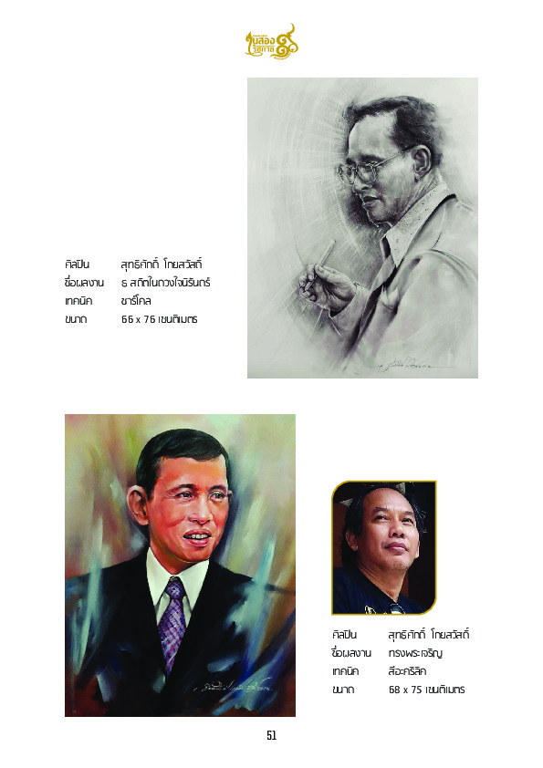 | คำสำคัญ : พระบาทสมเด็จพระปรมินทรมหาภูมิพลอดุลยเดช, ศิลปะ, เจ้าฟ้ามหาวชิราลงกรณ, บดินทรเทพยวรางกูร, พ่อหลวง, รัชกาลที่10, การวาดรูป, พระบรมฉายาสาทิสลักษณ์, ร.9, พระมหากษัตริย์ไทย, รัชกาลที่9, สมเด็จพระบรมโอรสาธิราช, นิทรรศการ, สูจิบัตร |