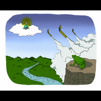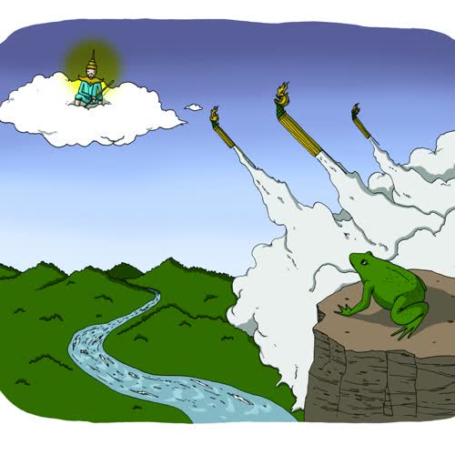 | คำอธิบาย : เมื่อครั้งพระโพฺสัตว์เสวยชาติเป็นพญาคันคาก (คางคก) อาศัยอยู่ใต้ต้นไม้ใหญ่ วันหนึ่งพญาแถน เทพบนชั้นสวรรค์ผู้ดลบันดาลให้ฝนตกรู้สึกไม่พอใจมนุษย์จึงไม่บันดาลฝนให้เป็นเวลา 7 ปี 7 เดือน 7 วัน ผู้คนทนไม่ไหวจึงคิดทำสงครามกับพญาแถน แต่พ่ายแพ้หนีมาพึ่ง พญาคันคากจึงออกอุบายให้เหล่าฝูงแมลงปลวก มอด ผึ้ง และแตนไปรุมทำร้ายฝ่ายเทวดา พญาแถนจนยอมจำนนให้คำสัญญาว่าจะรีบบันดาลน้ำฝนให้ทันทีที่มนุษย์ยิงบั้งไฟหรือเมื่อกบเขียดส่งเสียงร้อง |