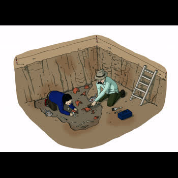 | คำอธิบาย : เมื่อนักโบราณคดีทำการศึกษาพื้นที่โดยสำรวจและสังเกตร่องรอยที่ปรากฏบนพื้นดินประกอบหลักฐานด้านอื่นๆ จนแน่ใจว่าบริเวณนั้นน่าจะเป็นแหล่งโบราณคดีแล้ว จะทำการขุดหลุมทดสอบ หลังจากนั้นจึงทำการขุดค้นทางโบราณคดีแบบเต็มรูปแบบเพื่อค้นหาหลักฐานที่เกี่ยวกับวัฒนธรรม วิถีชีวิตความเป็นอยู่ อายุสมัยของแหล่งโบราณคดี |