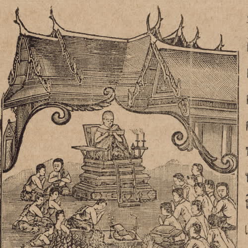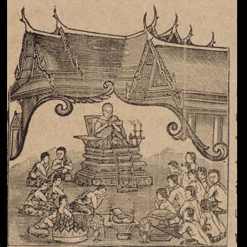 | คำอธิบาย : เทศนาสั่งสอนอุบาสก อุบาศิกา ภาพพิมพ์ลายเส้นจากหนังสือพุทธจริยา แต่งโดยพระยาปริยัติธรรมธาดา (แพ ตาละลักษณ์) เมื่อ ร.ศ.120 (พ.ศ.2445) |