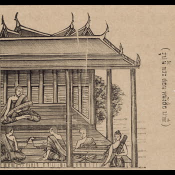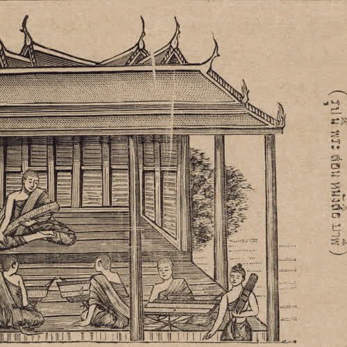 | คำอธิบาย : พระสงฆ์ผู้อาวุโสสอนหนังสือบาลีแก่พระสงฆ์ ภาพพิมพ์ลายเส้นจากหนังสือพุทธจริยา แต่งโดยพระยาปริยัติธรรมธาดา (แพ ตาละลักษณ์) เมื่อ ร.ศ.120 (พ.ศ.2445) |