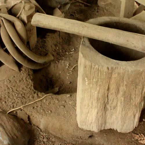 ชื่อเรื่อง : แผ่นถั่วเน่า ส่วนผสมและอุปกรณ์ ครกตำสมัยโบราณ |