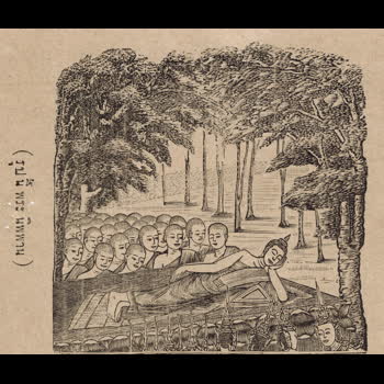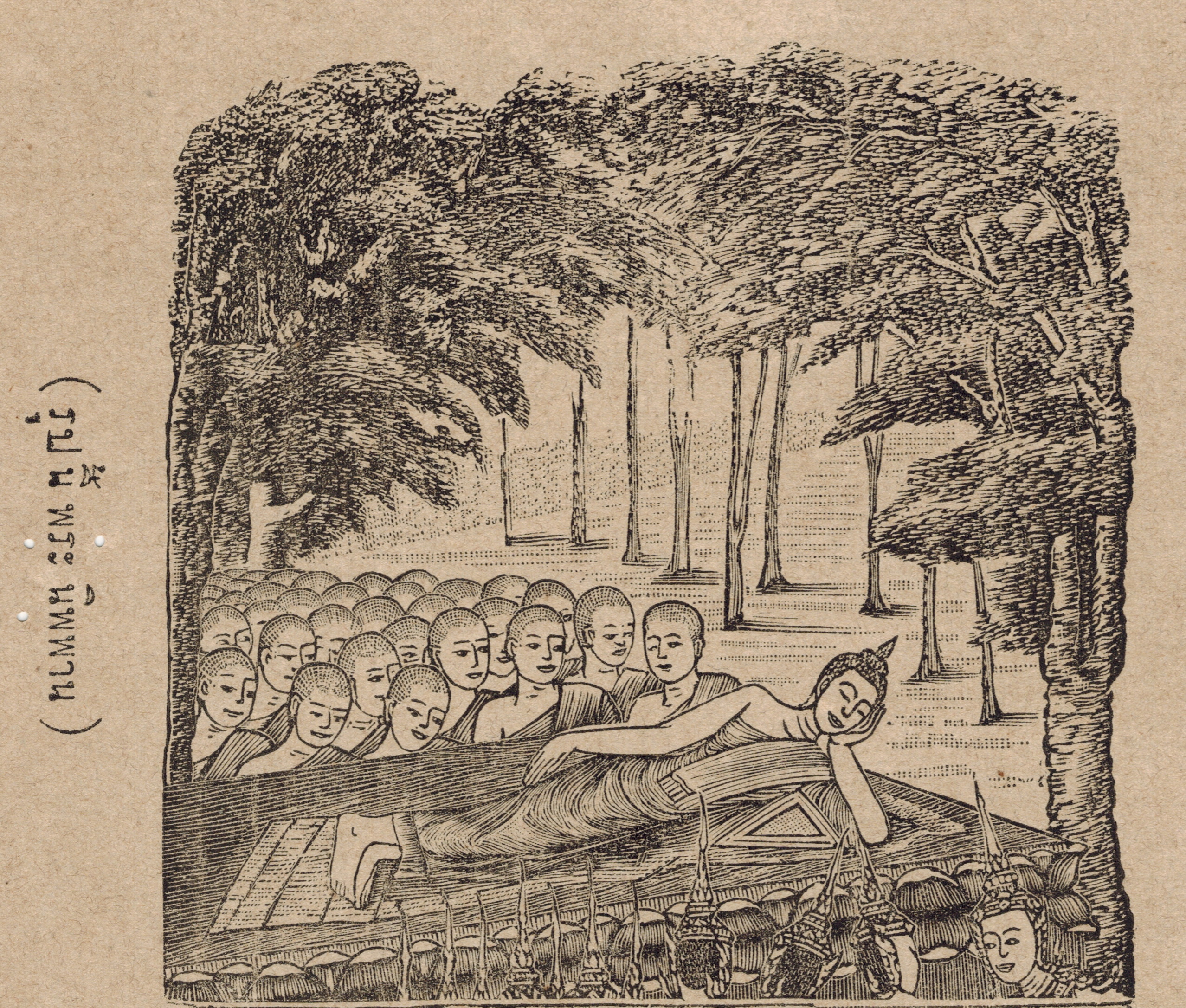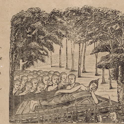 | คำอธิบาย : เสด็จดับขันธ์ปรินิพพาน ภาพพิมพ์ลายเส้นจากหนังสือพุทธจริยา แต่งโดยพระยาปริยัติธรรมธาดา (แพ ตาละลักษณ์) เมื่อ ร.ศ.120 (พ.ศ.2445) |