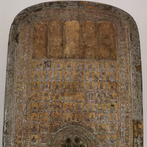 | คำอธิบาย : รอยพระพุทธบาทไม้ประดับมุกโบราณองค์นี้ ประดิษฐานอยู่ภายในวัดพระแท่นดงรังวรมหาวิหาร อ.ท่ามะกา จ.กาญจนบุรี โดยมีข้อสันนิษฐานว่า เป็นผีมือช่างหลวงสมัยพระเจ้าบรมโกศ ยุคอยุธยาตอนปลาย ลักษณะลวดลายสะท้อนให้เห็นถึงคสามเชื่อเรื่องสัญญาลักษณ์อันเป็นมงคล 108 ประการ |