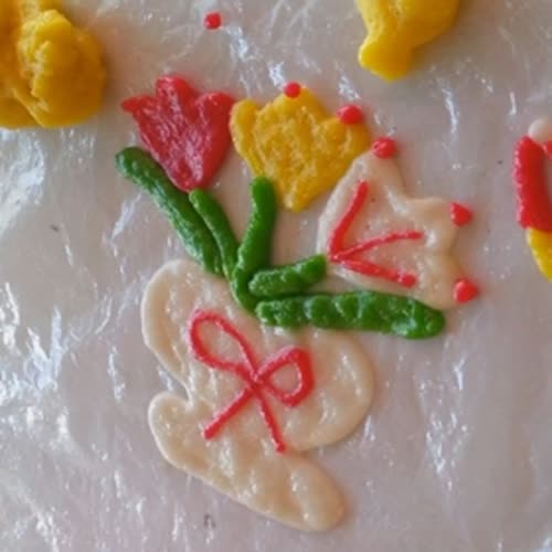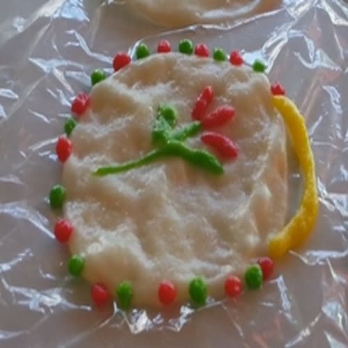 | คำอธิบาย : การทำข้าวเกรียบว่าว เริ่มจากการแช่ข้าวเหนียวแล้วนำไปนึ่ง เมื่อนึ่งจนสุกแล้วจึงนำมาตำในครกไม้ลักษณะเดียวกับครกตำข้าว โดยตำเมล็ดข้าวเหนียวให้ละเอียดจนเป็นแป้งเหนียวๆ ใช้เวลาประมาณ ๒๐ นาที หลังจากนั้นจึงนำน้ำตาลปี๊บใส่ลงตำให้เข้ากัน ในสัดส่วนโดยประมาณข้าวเหนียว ๑ กิโลกรัม ต่อน้ำตาลปี๊บ ๑/๒ กิโลกรัม โดยมักใช้น้ำตาลโตนดเป็นหลัก เมื่อได้แป้งที่ตำได้ที่แล้วจะนำแป้งบางส่วนมาแบ่ง เพื่อเติมสีผสมอาหารให้เป็นสีสรรต่างๆ ตามที่จะใช้งาน |