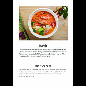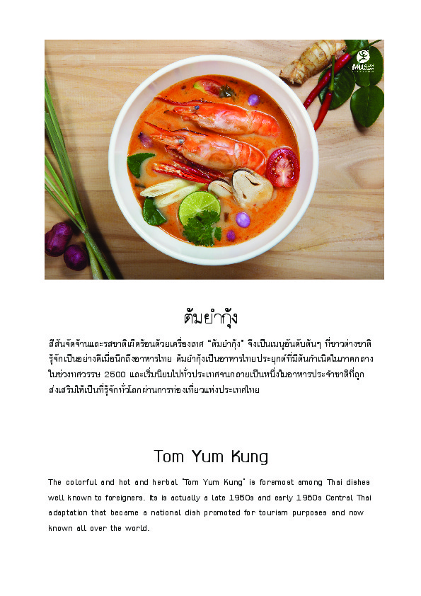 | คำอธิบาย : สีสันจัดจ้านและรสชาติเผ็ดร้อนด้วยเครื่องเทศ “ต้มยำกุ้ง” จึงเป็นเมนูอันดับต้นๆ ที่ชาวต่างชาติรู้จักเป็นอย่างดีเมื่อนึกถึงอาหารไทย ต้มยำกุ้งเป็นอาหารไทยประยุกต์ที่มีต้นกำเนิดในภาคกลางในช่วงทศวรรษ 2500 และเริ่มนิยมไปทั่วประเทศจนกลายเป็นหนึ่งในอาหารประจำชาติที่ถูกส่งเสริมให้เป็นที่รู้จักทั่วโลกผ่านการท่องเที่ยวแห่งประเทศไทย |
