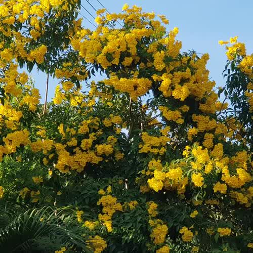 | คำอธิบาย : ทองอุไร ดอกสีเหลืองสด มีรูปลักษณ์คลายระฆัง หรือแตร หรือทรัมเป็ต ออกดอกเป็นช่อตามปลายกิ่ง ปลายกลีบมี 5 กลีบ มีลักษณะกลมเป็นคลื่นเล็กน้อย |
