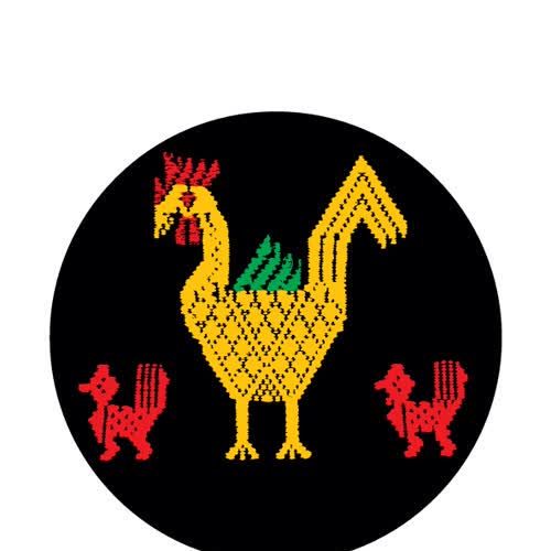 "เส้นด้ายปักรูปไก่บนย่าม".