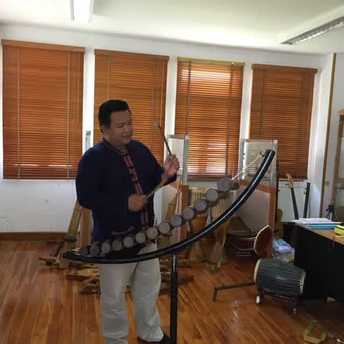 | คำอธิบาย : โปงลาง ดนตรีพื้นเมืองอีสานถือว่าจังหวะสำคัญมาก เครื่องดนตรีประเภทตีใช้ดำเนินทำนองอย่างเดียวคือ โปงลาง โปงลางมีวิวัฒนาการมาจากระฆังแขวนคอสัตว์เพื่อให้เกิดเสียงโปงลางที่ใช้บรรเลงอยู่ในภาคอีสาน ปัจจุบันนิยมทำจากไม้มะหาด หรือไม้หมากเหลื้อม เพราะเป็นไม้ที่มีความอยู่ตัวมากกว่าไม้อื่นๆ "โปงลาง" นี้ มีการเล่นแพร่หลายทางภาคอีสานตอนกลางและตอนเหนือบางส่วน โดยเฉพาะจังหวัดกาฬสินธุ์ มีการเล่นแพร่หลายมาก เพราะเป็นที่กำเนิดโปงลาง มีประวัติการจัดทำและเล่นมาตั้งแต่ปี พ.ศ.2490 |