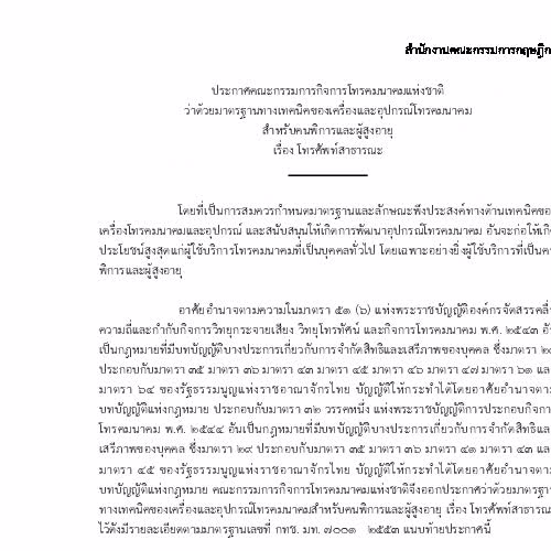 "ประกาศคณะกรรมการกิจการโทรคมนาคมแห่งชาติ ว่าด้วยมาตรฐานทางเทคนิคของเครื่องและอุปกรณ์โทรคมนาคม สําหรับคนพิการและผู้สูงอายุ เรื่อง โทรศัพท์สาธารณะ".