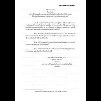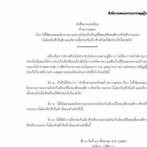 คำสั่งนายทะเบียนที่ ๕๐/๒๕๕๙ เรื่อง ให้ใช้แบบและข้อความกรมธรรม์ประกันภัยอุบัติเหตุเพื่อคนพิการสําหรับรายย่อย (ไมโครอินชัวรันส์) และอัตราเบี้ยประกันภัย สําหรับบริษัทประกันวินาศภัย ได้รับใบอนุญาตภายใต้ ให้เผยแพร่-โดยต้องระบุที่มาแต่ห้ามดัดแปลงและห้ามใช้เพื่อการค้า 3.0 Thailand.