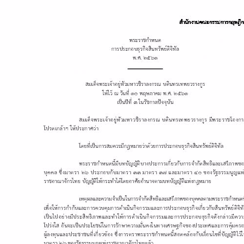 | คำสำคัญ : การประกอบธุรกิจสินทรัพย์ดิจิทัล, ธุรกิจ, พ.ศ. ๒๕๖๑, ดิจิทัล, พระราชกำหนด, ประกอบะธุรกิจ, สินทพรัพย์ |