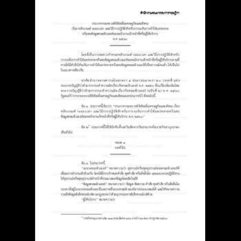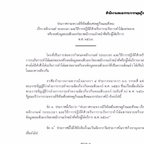 ประกาศกระทรวงดิจิทัลเพื่อเศรษฐกิจและสังคม เรื่อง หลักเกณฑ์ ระยะเวลาและวิธีการปฏิบัติสำหรับการระงับการทำให้แพร่หลายหรือลบข้อมูลคอมพิวเตอร์ของพนักงานเจ้าหน้าที่หรือผู้ให้บริการ พ.ศ. ๒๕๖๐ ได้รับใบอนุญาตภายใต้ ให้เผยแพร่-โดยต้องระบุที่มาแต่ห้ามดัดแปลงและห้ามใช้เพื่อการค้า 3.0 Thailand.
