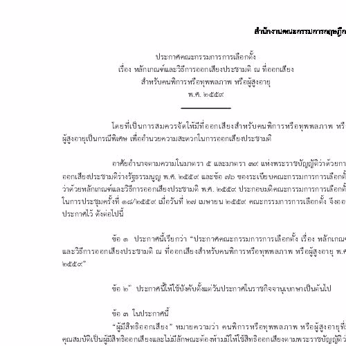 ประกาศคณะกรรมการการเลือกตั้ง เรื่อง หลักเกณฑและวิธีการออกเสียงประชามติ ณ ที่ออกเสียง สําหรับคนพิการหรือทุพพลภาพ หรือผู+สูงอายุ ได้รับใบอนุญาตภายใต้ ให้เผยแพร่-โดยต้องระบุที่มาแต่ห้ามดัดแปลงและห้ามใช้เพื่อการค้า 3.0 Thailand.