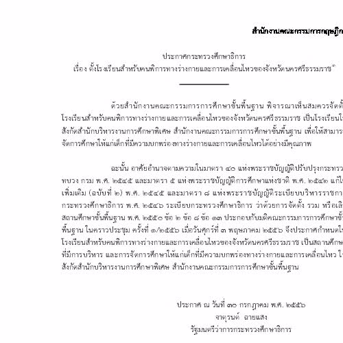 รีวิว : ประกาศกระทรวงศึกษาธิการ เรื่อง ตั้งโรงเรียนสำหรับคนพิการทางร่างกายและการเคลื่อนไหวของจังหวัดนครศรีธรรมราช