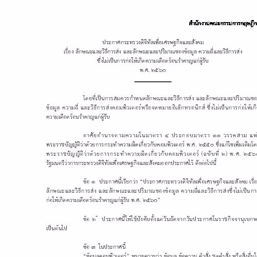 ประกาศกระทรวงดิจิทัลเพื่อเศรษฐกิจและสังคม เรื่อง ลักษณะและวิธีการส่ง และลักษณะและปริมาณของข้อมูล ความถี่และวิธีการส่ง ซึ่งไม่เป็นการก่อให้เกิดความเดือดร้อนรำคาญแก่ผู้รับ พ.ศ. ๒๕๖๐ ได้รับใบอนุญาตภายใต้ ให้เผยแพร่-โดยต้องระบุที่มาแต่ห้ามดัดแปลงและห้ามใช้เพื่อการค้า 3.0 Thailand.