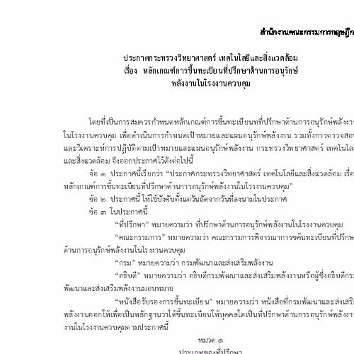 "ประกาศกระทรวงวิทยาศาสตร์ เทคโนโลยีและสิ่งแวดล้อม เรื่อง หลักเกณฑ์การขึ้นทะเบียนที่ปรึกษาด้านการอนุรักษ์ พลังงานในโรงงานควบคุม".